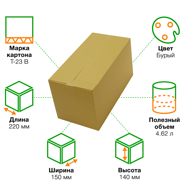 Короб К-110 бурого цвета, длиной 220 мм, шириной 150 мм и высотой 140 мм. Изготовлен из трехслойного картона марки Т-23 В. Полезный объём — 4.63 л.