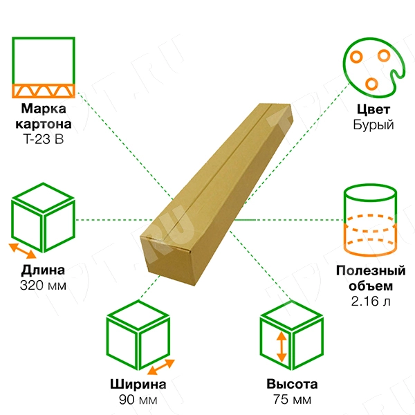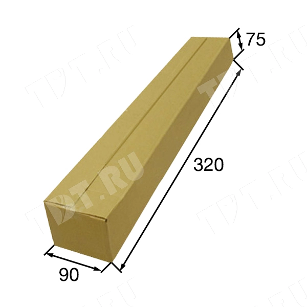 Короб К-133 бурый, длиной 320 мм, шириной 90 мм и высотой 75 мм. Изготовлен из трёхслойного картона Т-23 В. Полезный объём — 2.16 л.