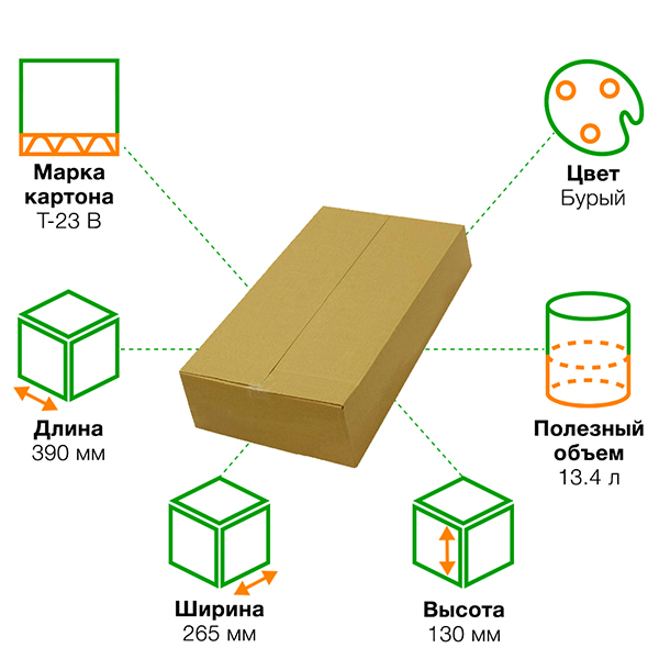 Короб К-116 бурого цвета, длиной 390 мм, шириной 265 мм и высотой 130 мм. Изготовлен из трехслойного картона марки Т-23 В. Полезный объём — 13.4 л.
