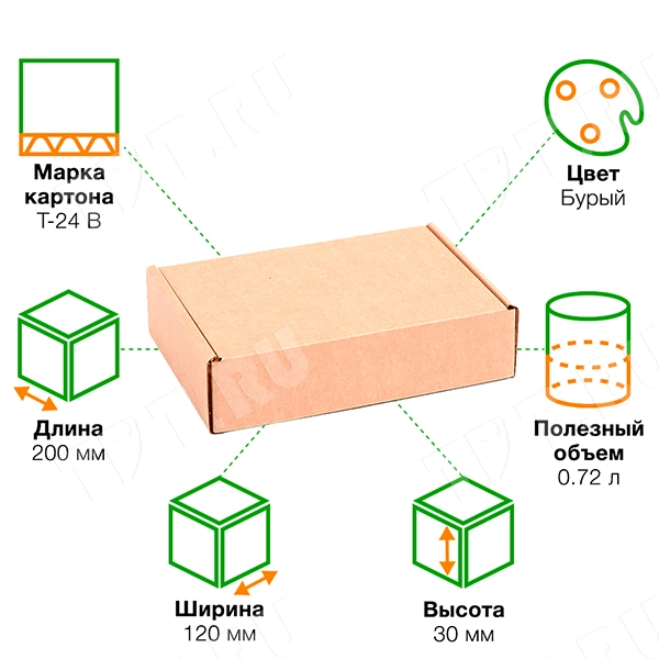 Короб КС-21 бурый, длиной 200 мм, шириной 120 мм и высотой 30 мм. Изготовлен из трёхслойного картона Т-24 В. Полезный объём — 0.72 л.