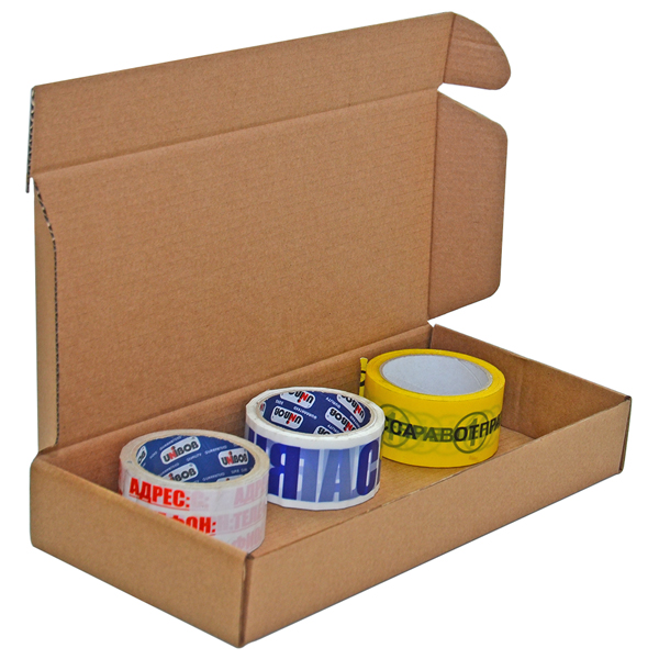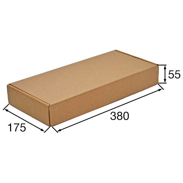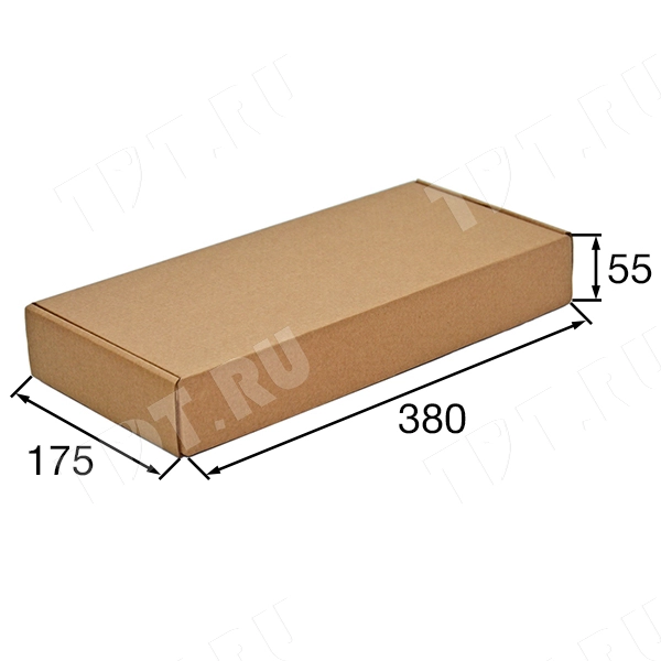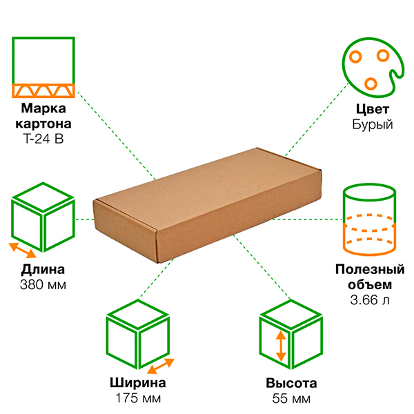 Короб КС-55 бурый, длиной 380 мм, шириной 175 мм и высотой 55 мм. Изготовлен из трёхслойного картона Т-24 В. Полезный объём — 3.66 л.