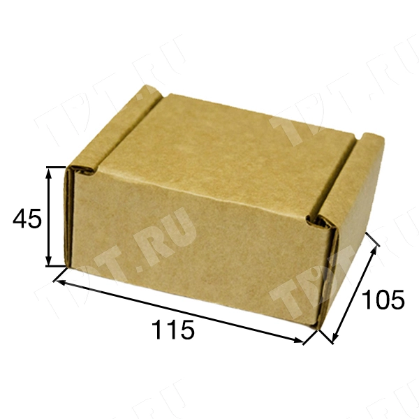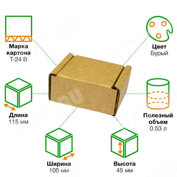Короб КС-120 бурый, длиной 115 мм, шириной 105 мм и высотой 45 мм. Изготовлен из трёхслойного картона Т-24 В. Полезный объём — 0.53 л.
