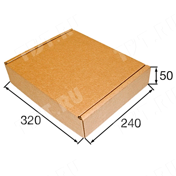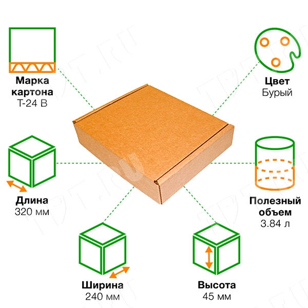 Короб КС-77 бурый, длиной 320 мм, шириной 240 мм и высотой 50 мм. Изготовлен из трёхслойного картона Т-24 В. Полезный объём — 3.84 л.