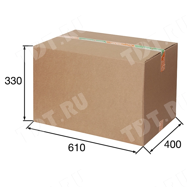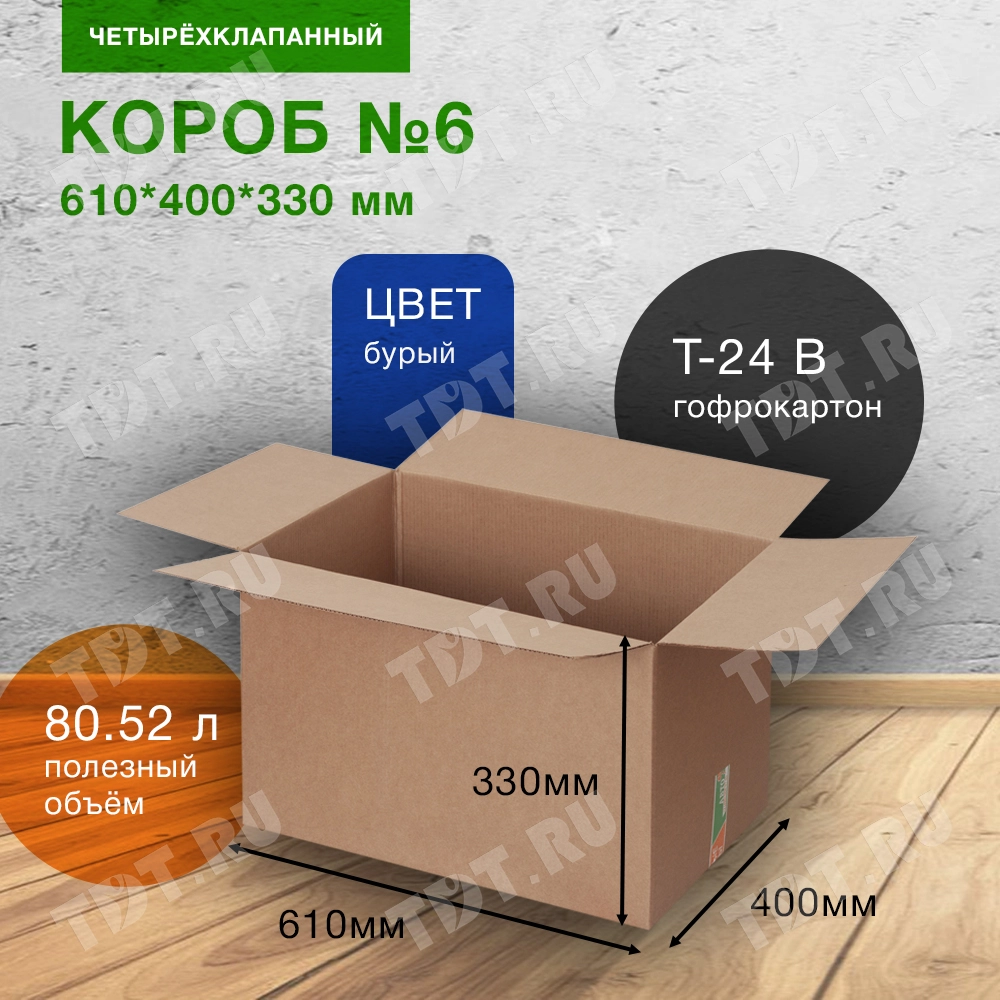 Картонный короб №6 (универсальный) для хранения вещей, длиной 610 мм, шириной 400 мм и высотой 330 мм. Изготовлен из трехслойного картона марки Т-24 В. Полезный объём — 80.52 л.