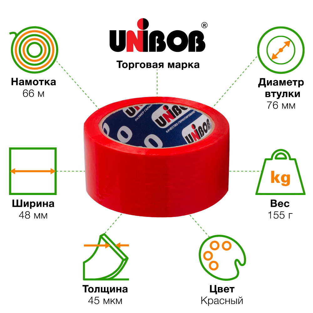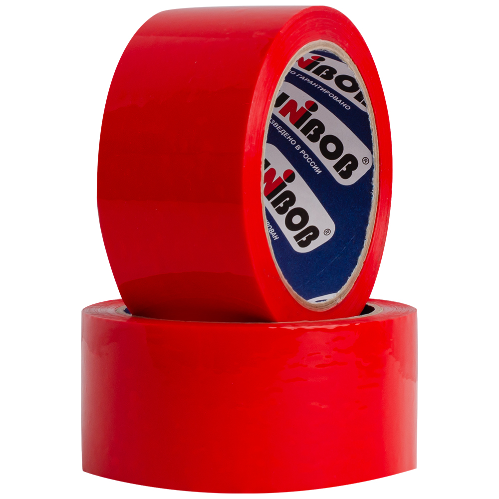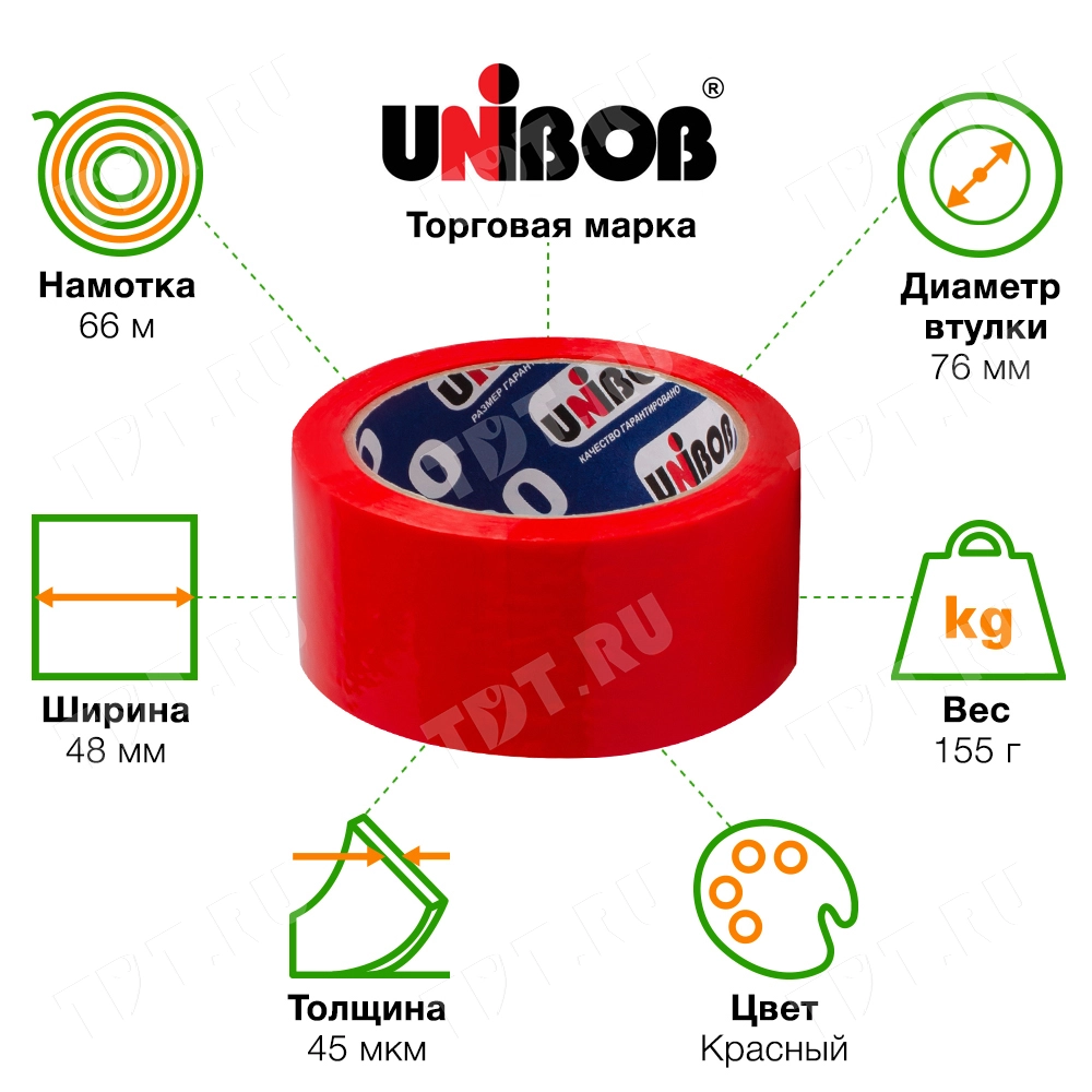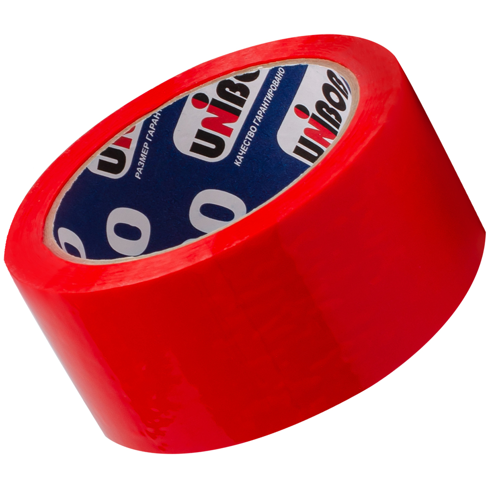 Красная клейкая лента Unibob® шириной 48 мм, диаметром втулки 76 мм, намоткой 66 метров. Изготовлена на основе полипропилена.