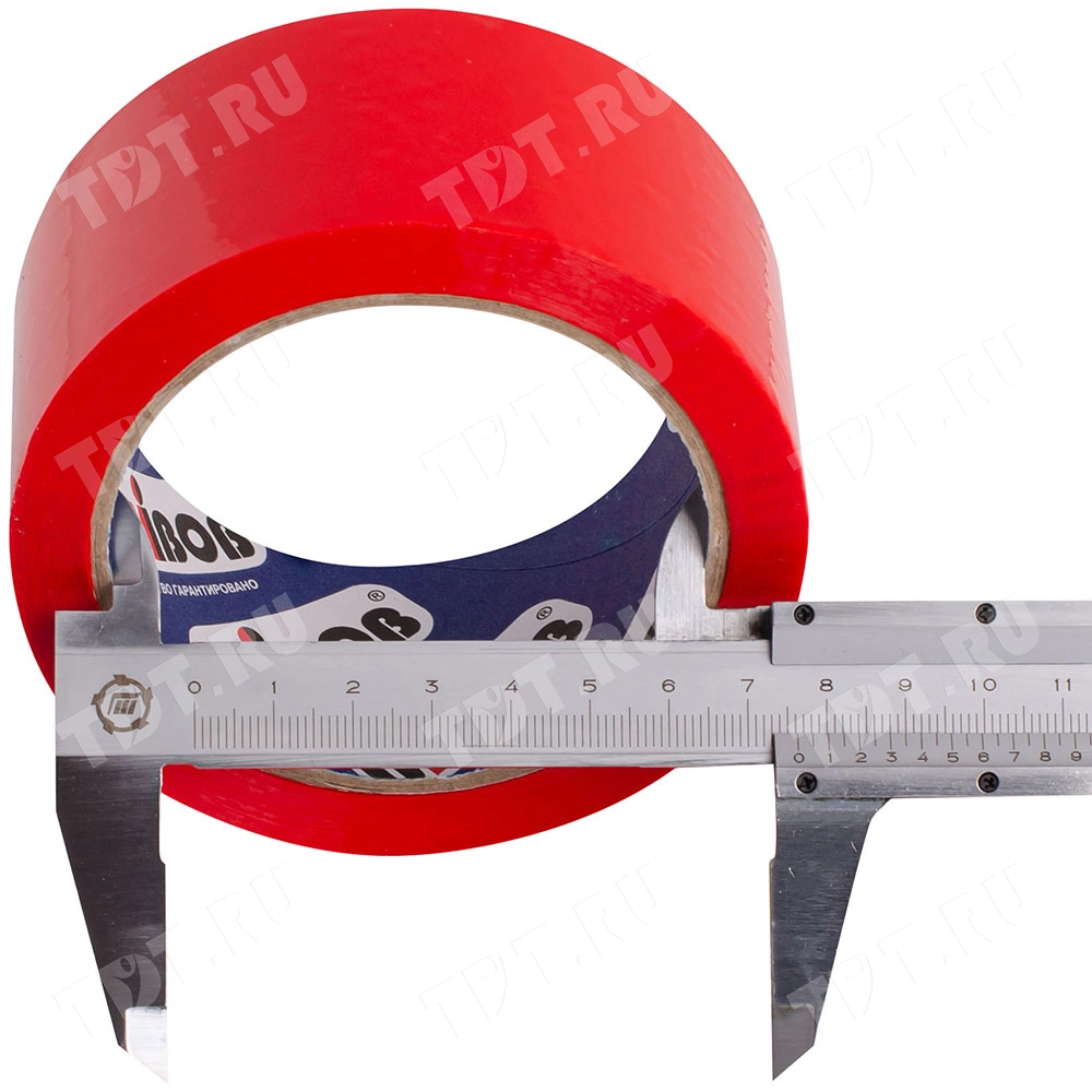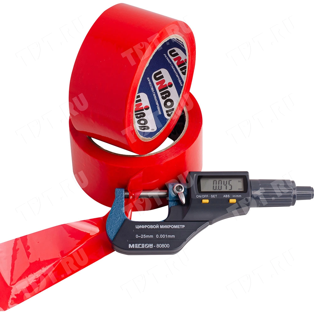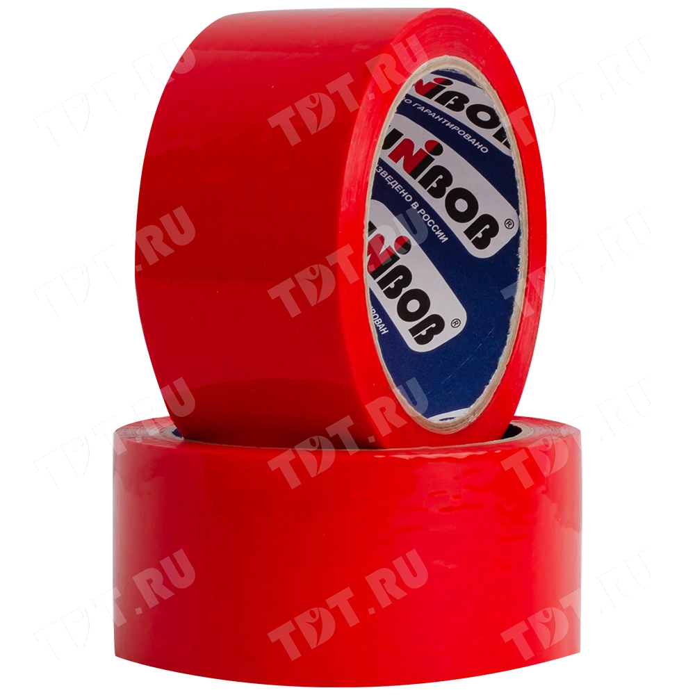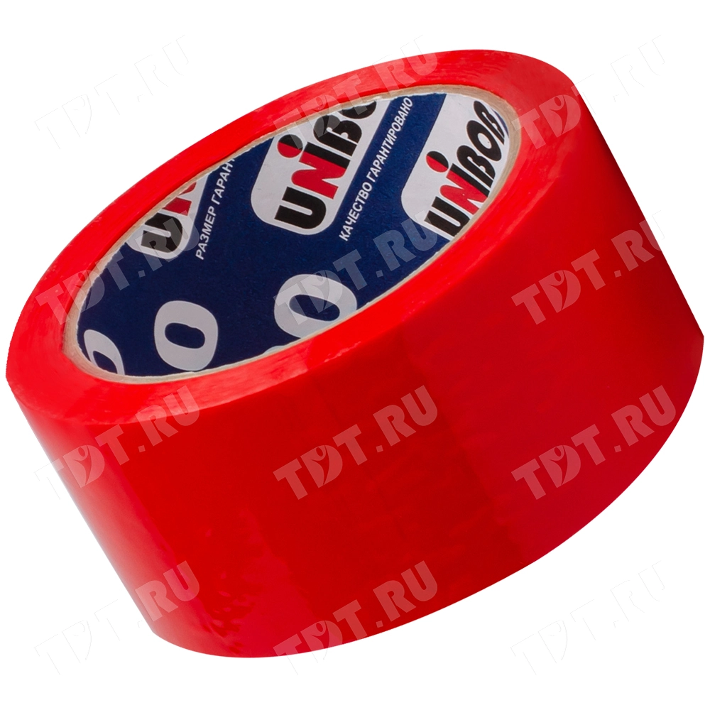 Красная клейкая лента Unibob® шириной 48 мм, диаметром втулки 76 мм, намоткой 66 метров. Изготовлена на основе полипропилена.