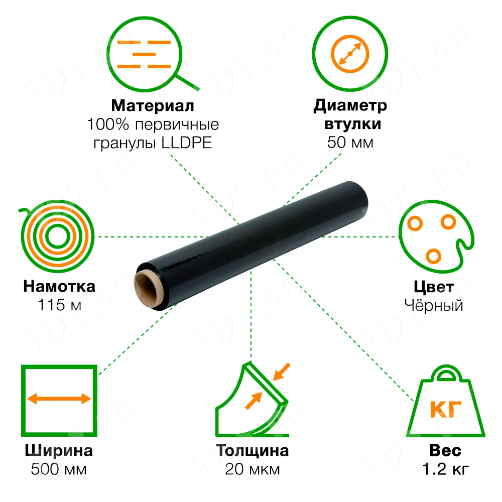 Черная стрейч пленка ПолимерНова в рулоне, намоткой 115 м, шириной 500 мм, толщиной 20 мкм. Изготовлена из первичных гранул LLDPE. Производится в России.
