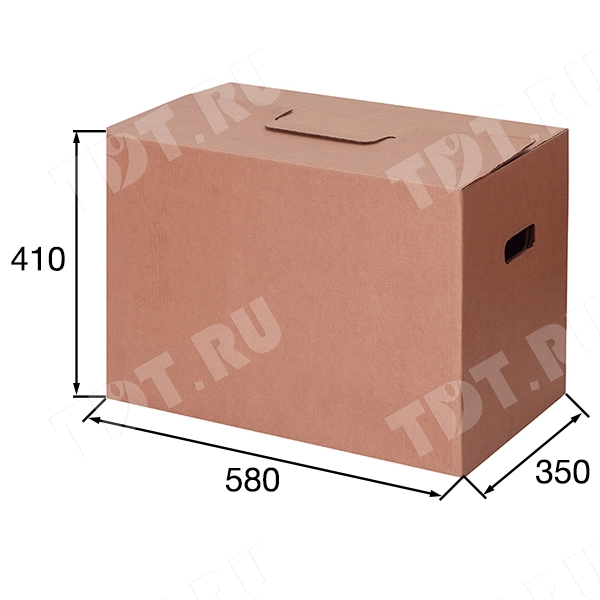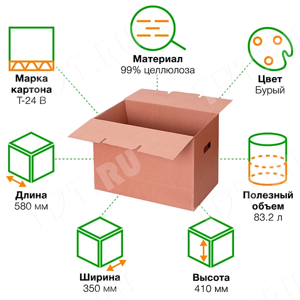 Самосборный короб №18, длиной 580 мм, шириной 350 мм и высотой 410 мм. Изготовлен из трёхслойного гофрокартона марки Т-24 В. Полезный объём — 83.2 л.