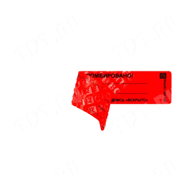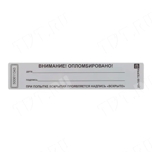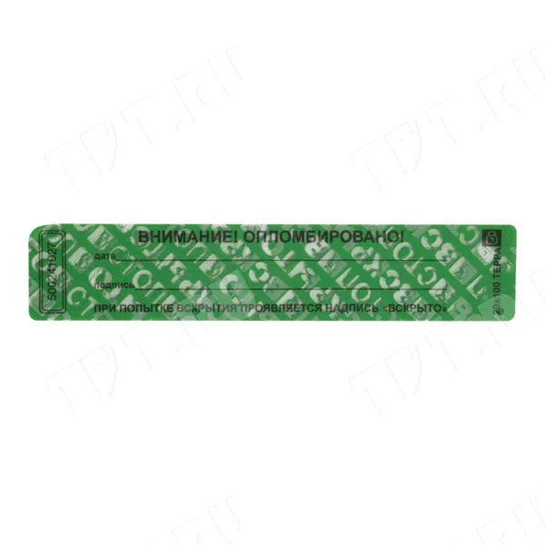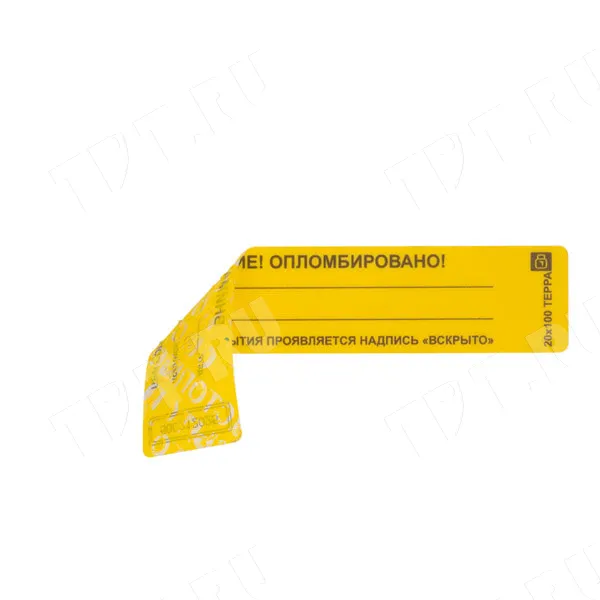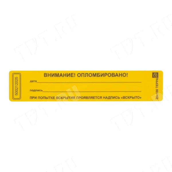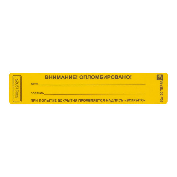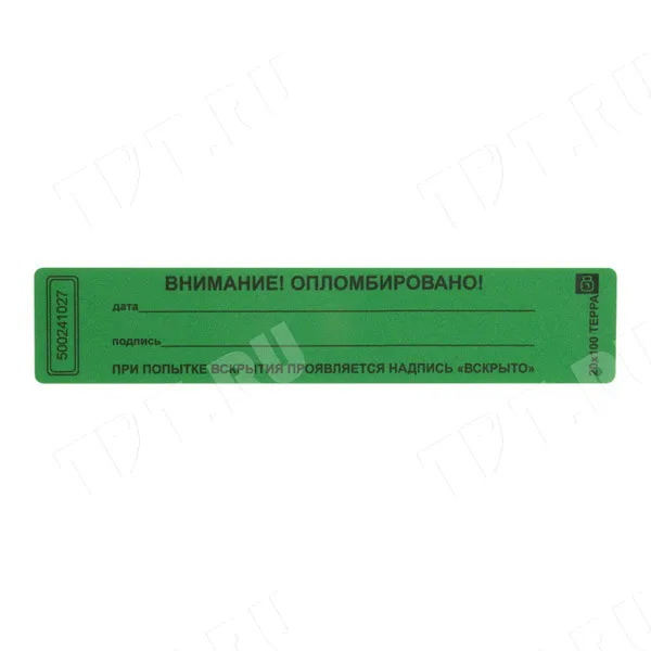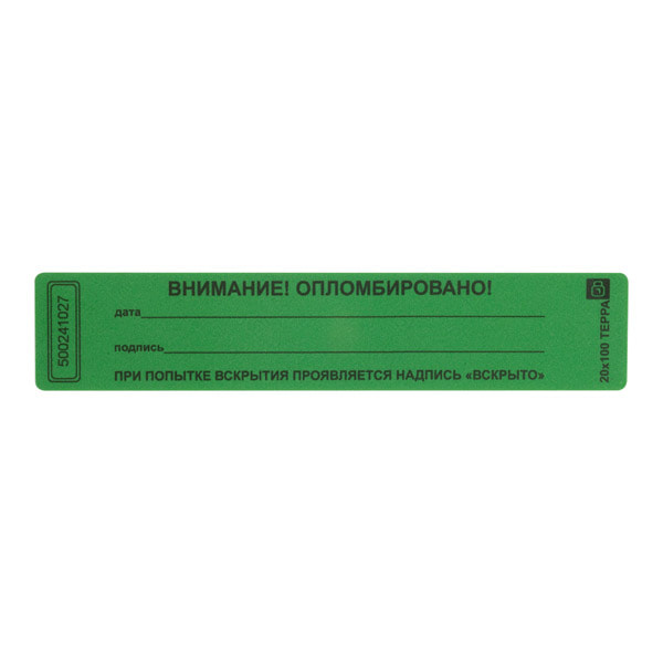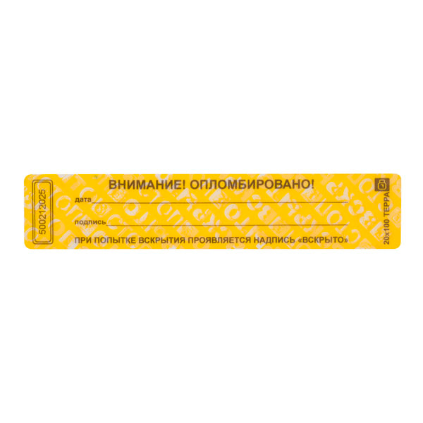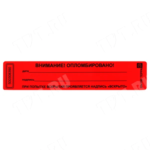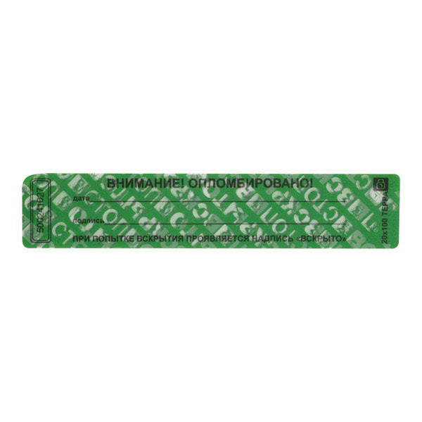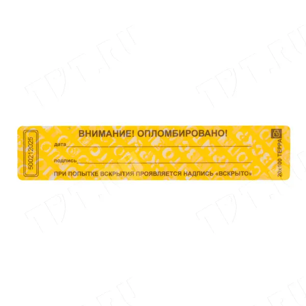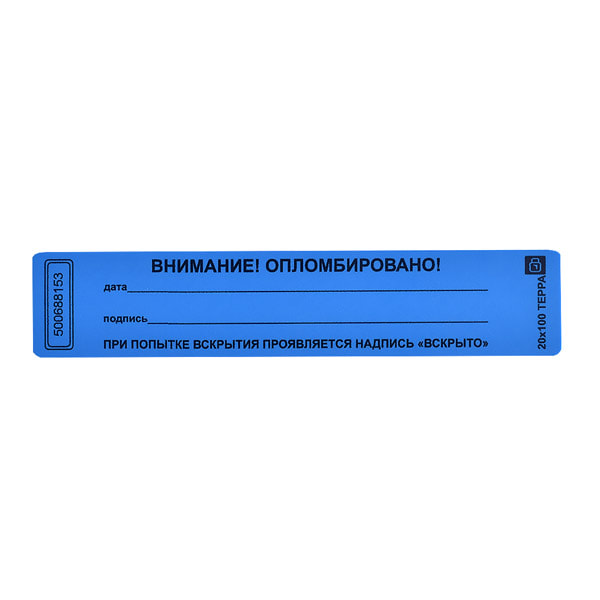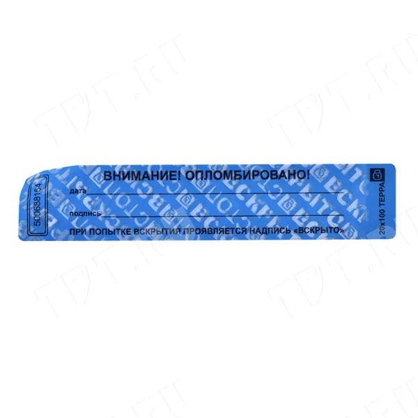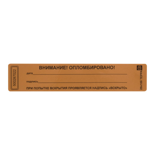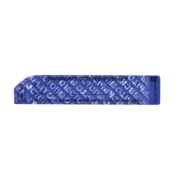Пломбы наклейки ТЕРРА «ВНИМАНИЕ! ОПЛОМБИРОВАНО!», прямоугольные, разных цветов, диной 100 мм, шириной 20 мм. Производятся в России.