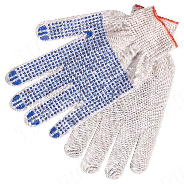 Рабочие хлопчатобумажные перчатки Стандарт с точечным ПВХ покрытием. Защищают руки от повреждений и загрязнений. Производятся в России.