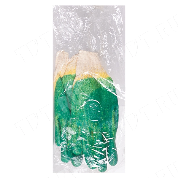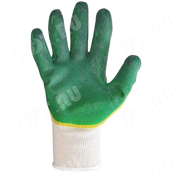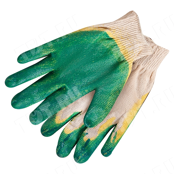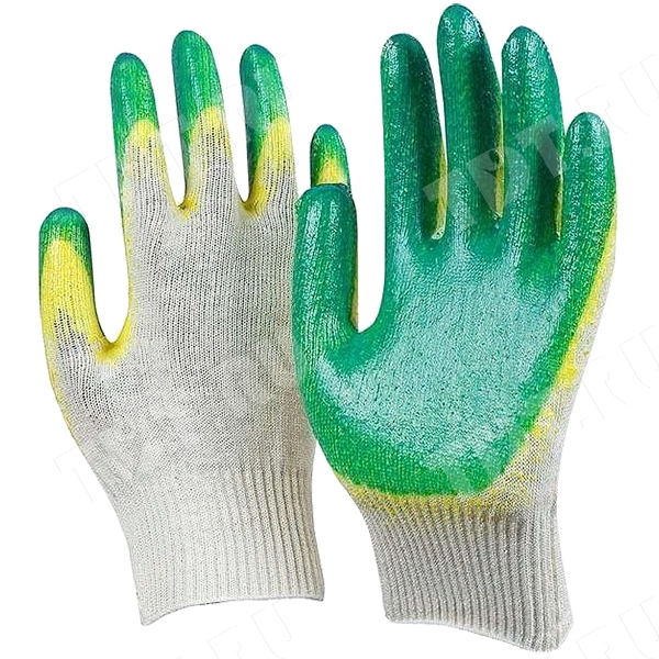 Перчатки х/б с двухслойным латексным покрытием, зеленого цвета. Защищают руки от различных повреждений и загрязнений. Производятся в России.