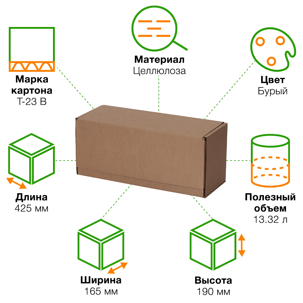 Почтовый короб тип «В» бурого цвета, длиной 425 мм, шириной 165 мм и высотой 190 мм. Изготовлен из трёхслойного гофрокартона Т-23 В. Полезный объём — 13.32 л.