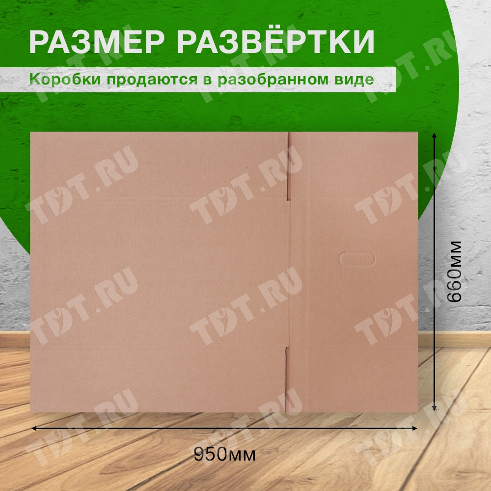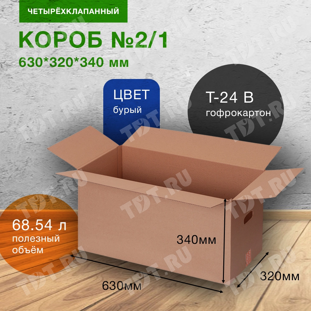 Короб №2/1 (средний) с ручками, длиной 630 мм, шириной 320 мм и высотой 340 мм. Изготовлен из трёхслойного гофрокартона марки Т-24 В. Полезный объём — 68.54 л.