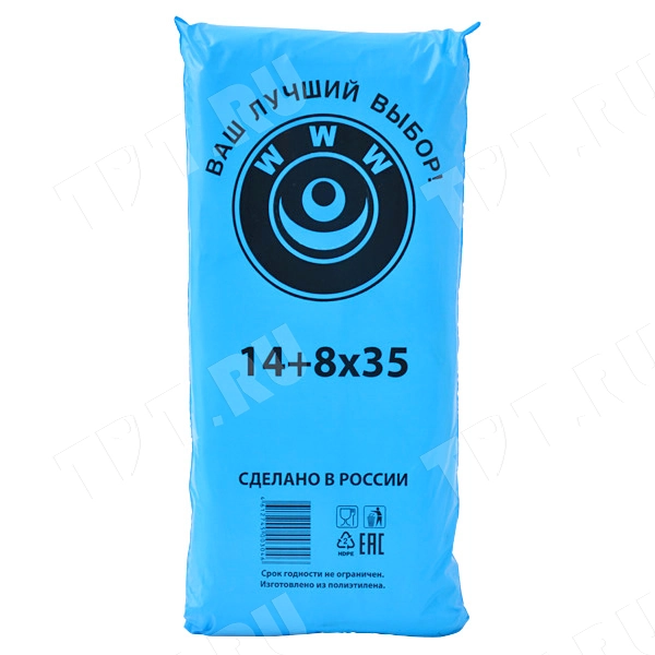 Прозрачные фасовочные пакеты ПНД в пластах «WWW» для упаковки длиной 35 см, шириной 14+8 см, толщиной 8 мкм, в упаковке по 700±3% штук. Материал – полиэтилен низкого давления. Отвечают требованиям ГОСТа на плёнку ПНД (16338-85). Производятся в России.