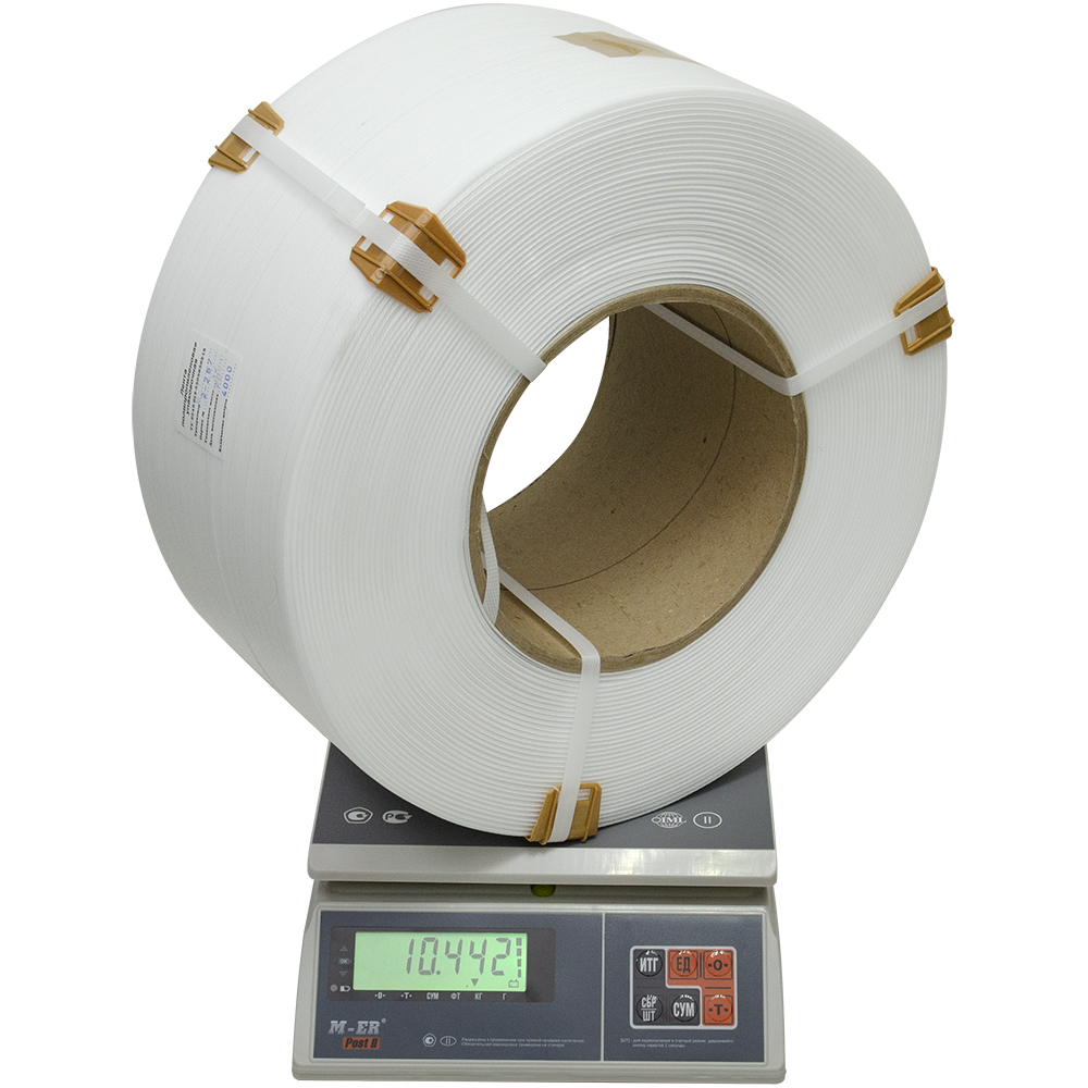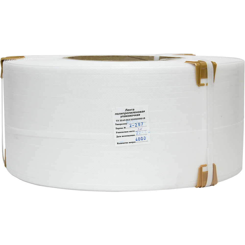 Упаковочная полипропиленовая лента (ПП) Лентапром, белого цвета, намоткой 4000 м, шириной 9 мм, толщиной 0.5 мм, усилием на разрыв 90 кГс, весом 10.442 кг, транспортировочным объемом 0.02928 м³. Диапазон рабочих температур от -30 до +60°C. Производится в России.