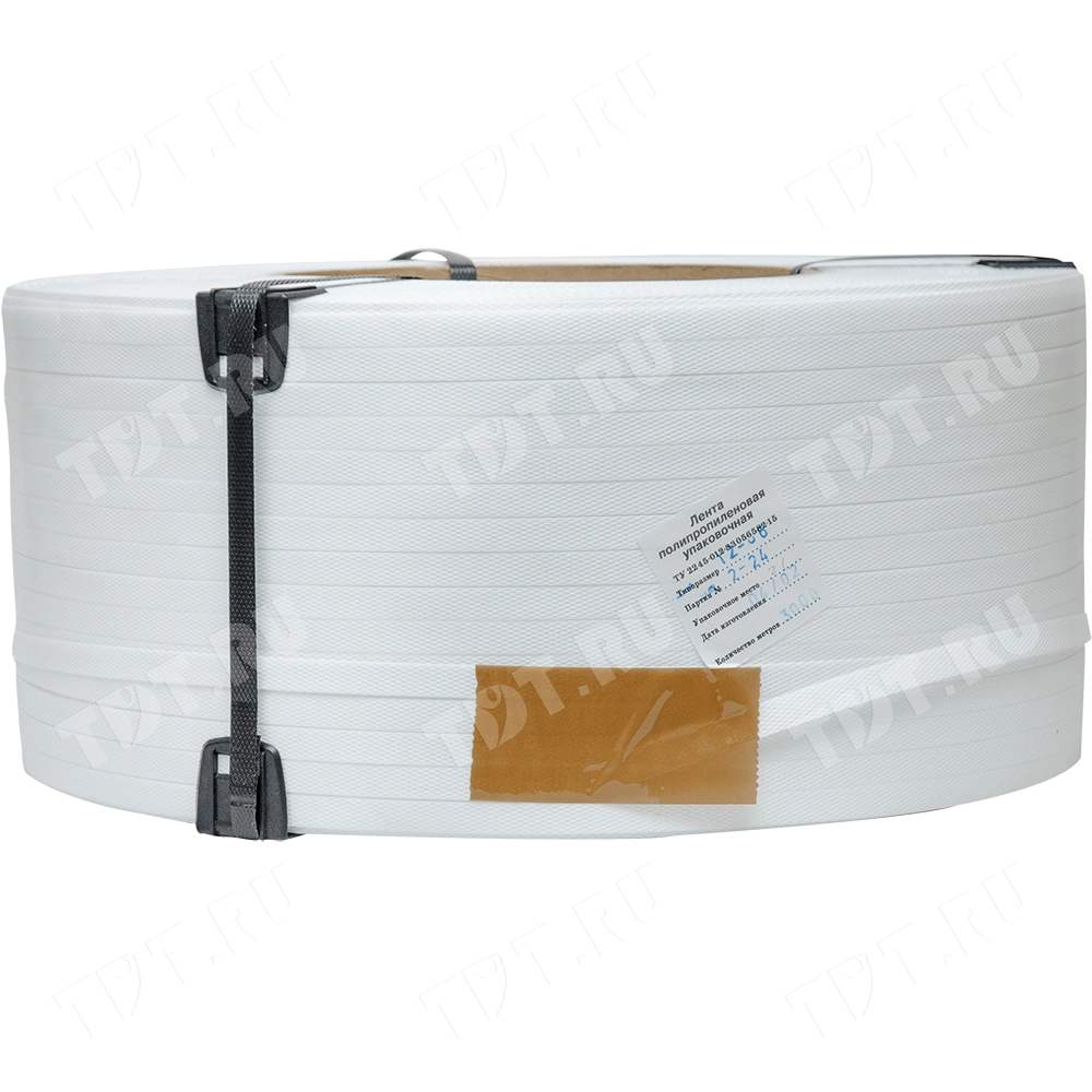 Упаковочная полипропиленовая лента (ПП) Лентапром, белого цвета, намоткой 3000 м, шириной 12 мм, толщиной 0.6 мм, усилием на разрыв 130 кГс, весом 10.75 кг, транспортировочным объемом 0.031862 м³. Диапазон рабочих температур от -30 до +60°C. Производится в России.