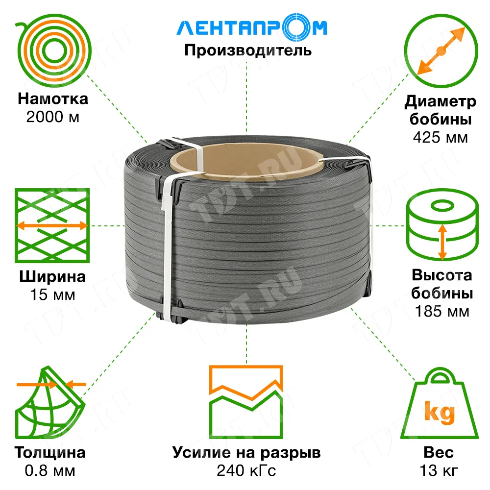 Упаковочная полипропиленовая лента (ПП) Лентапром, серого цвета, намоткой 2000 м, шириной 15 мм, толщиной 0.8 мм, усилием на разрыв 240 кГс, весом 13 кг, транспортировочным объемом 0.033416 м³. Диапазон рабочих температур от -30 до +60°C. Производится в России.