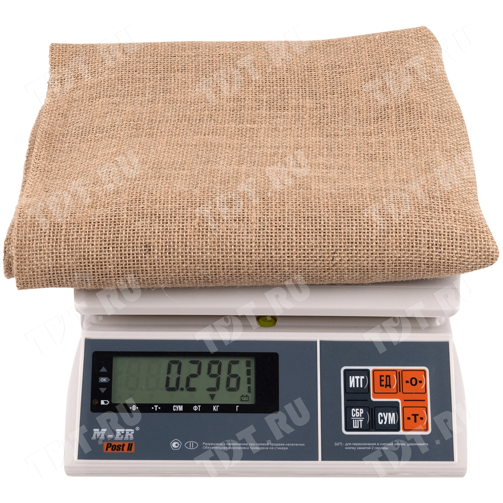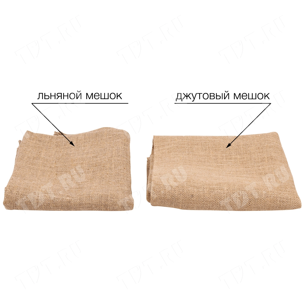 Джутовый мешок, длиной 96 см, шириной 56 см, плотностью 350 г/м², весом 296 г. Изготовлен из 100% джута. Производится в России.