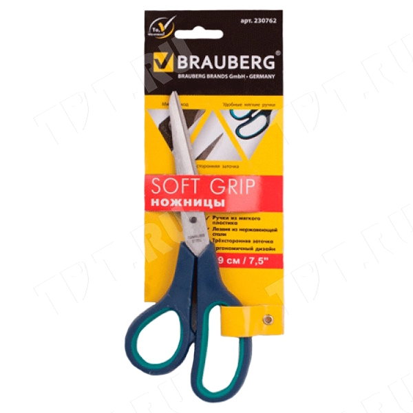 Ножницы Brauberg «SOFT GRIP», код производителя 230762, длина лезвий 190 мм, серо-зеленого цвета. Материал – нержавеющая сталь и мягкий пластик. Продаются в картонной упаковке с европодвесом. Производятся в России.