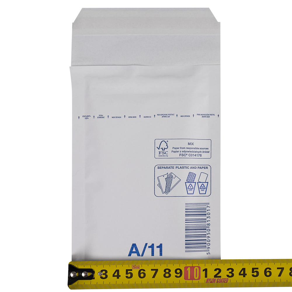 Белый крафт-пакет с воздушной прослойкой шириной 12 см и длиной 17 см. Внутренние размеры - 10*16 см. Изготовлен из крафт-бумаги и полиэтилена (внутренняя вставка). Производится в России.