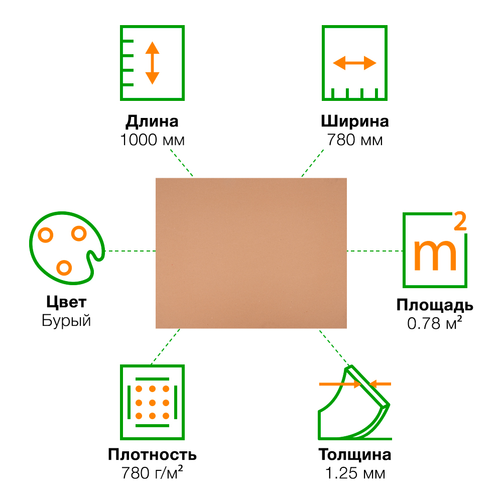 Переплетный картон, бурого цвета, длиной 1000 мм, шириной 780 мм, толщиной 1.25 мм, плотностью 780 г/м², площадью 0.78 м². Материал – высококачественный картон. Производится в России.