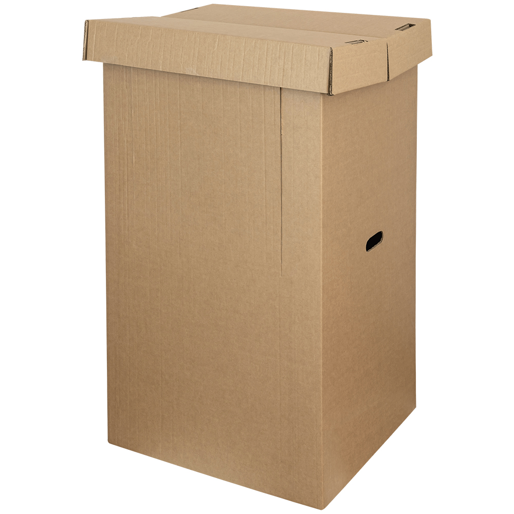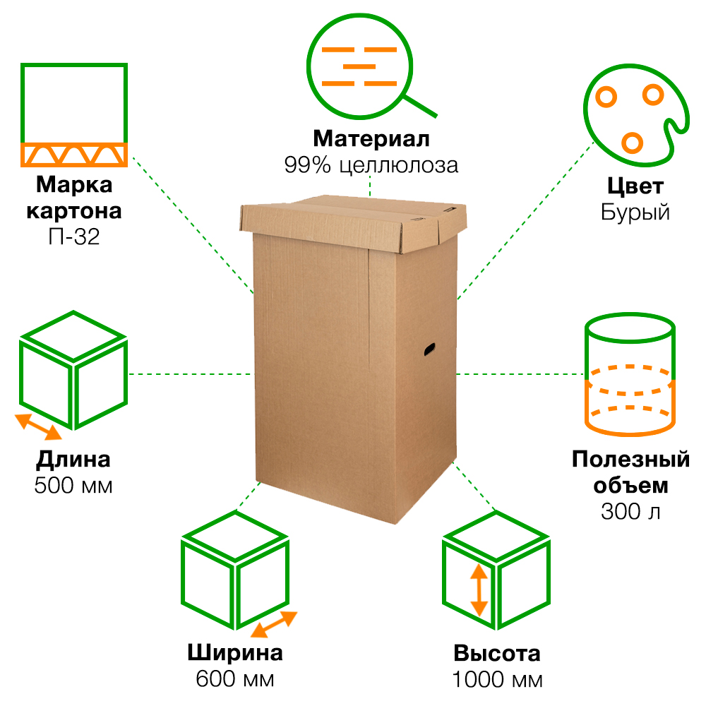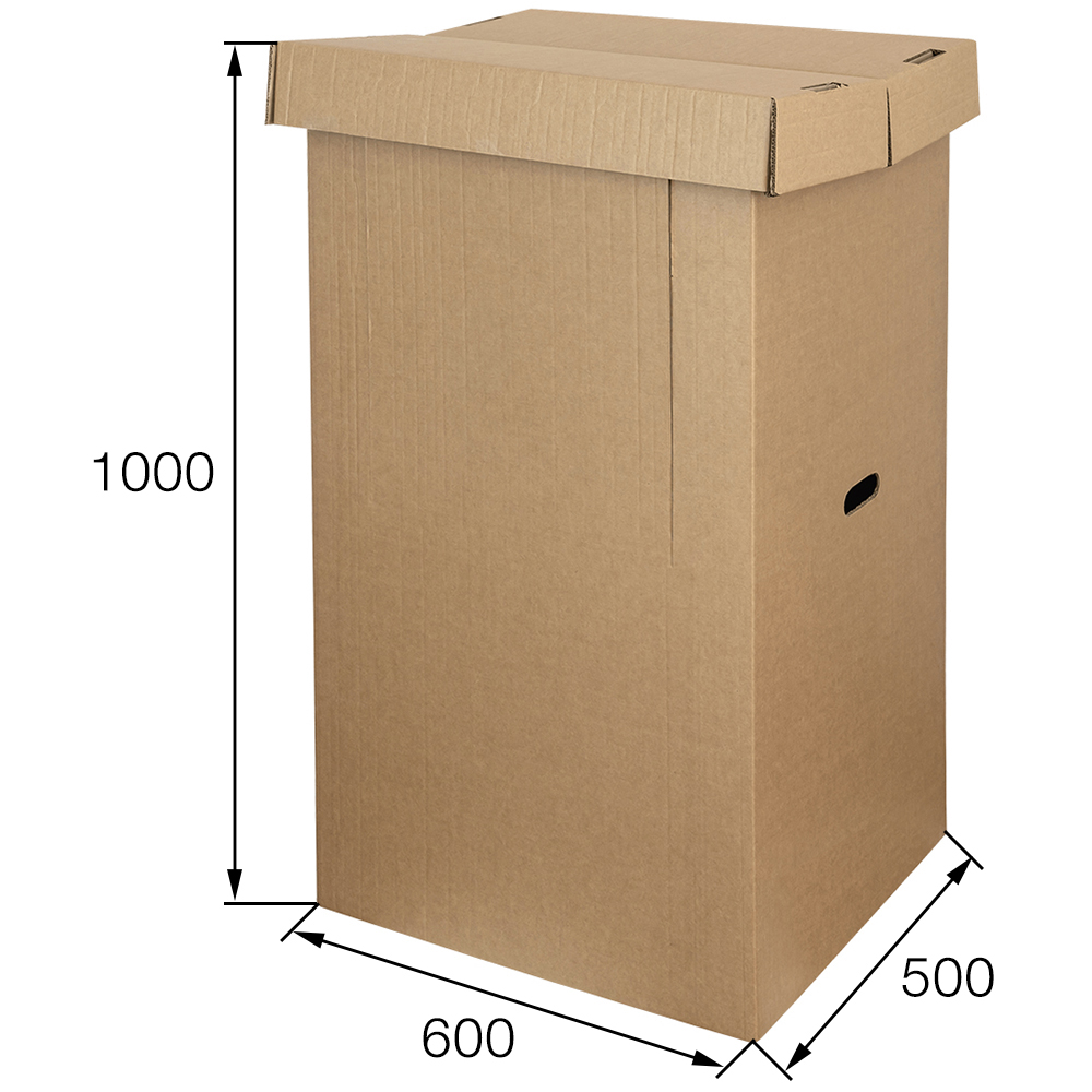 Картонный короб №16 (малый гардеробный), с крышкой, длиной 500 мм, шириной 600 мм и высотой 1000 мм. Изготовлен из пятислойного картона марки П-32. Полезный объём — 300 л. Для удобной переноски на коробке предусмотрены ручки.