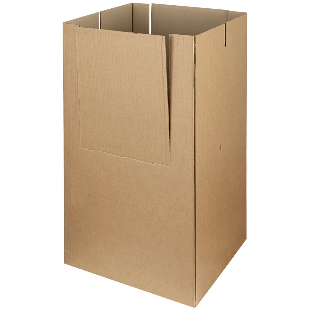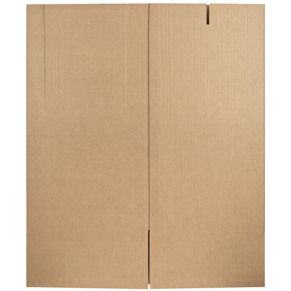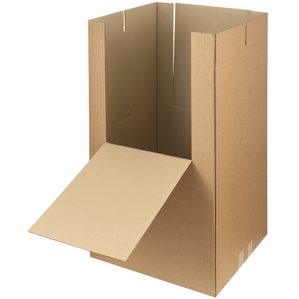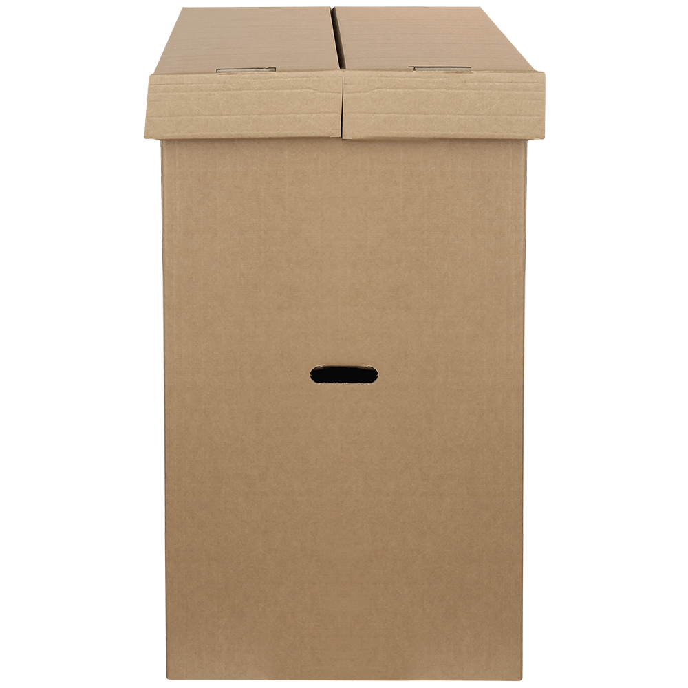 Картонный короб №16 (малый гардеробный), с крышкой, длиной 500 мм, шириной 600 мм и высотой 1000 мм. Изготовлен из пятислойного картона марки П-32. Полезный объём — 300 л. Для удобной переноски на коробке предусмотрены ручки.