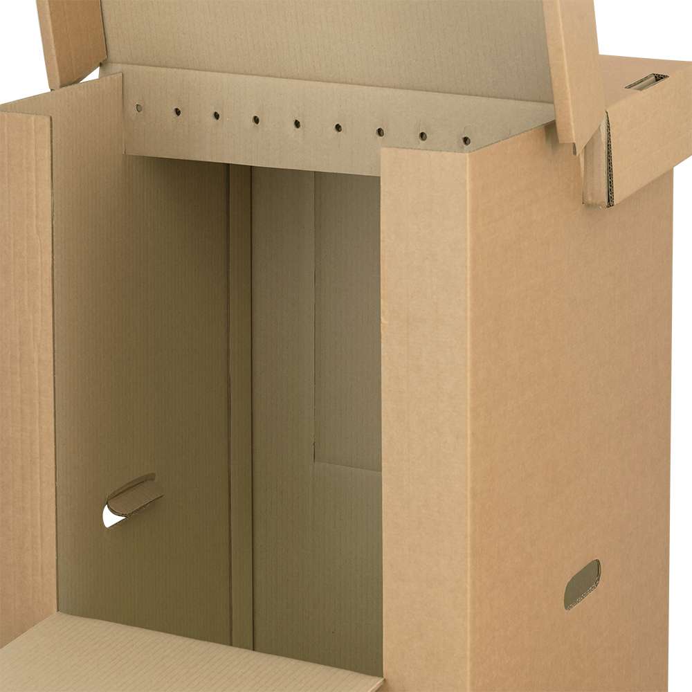 Короб изготовлен из пятислойного картона, поэтому рассчитан на большой вес. К сожалению, длина малого гардеробного короба — один метр, поэтому для крупных вещей советуем заказать большой короб: