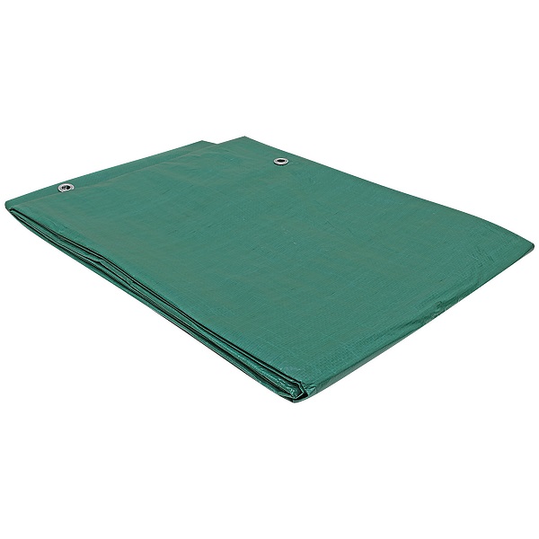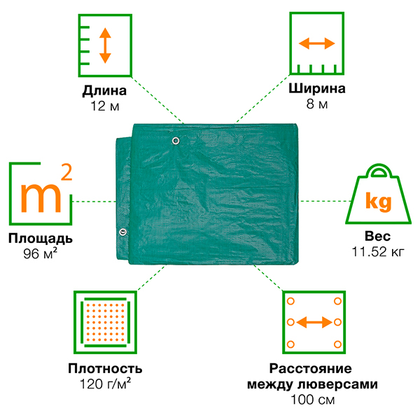 Зеленый универсальный защитный тент «Тарпаулин®» с люверсами большого размера из особо прочной полиэтиленовой ткани длиной 12 м, шириной 8 м, площадью 96 м², плотностью 120 г/м². Производится в России.