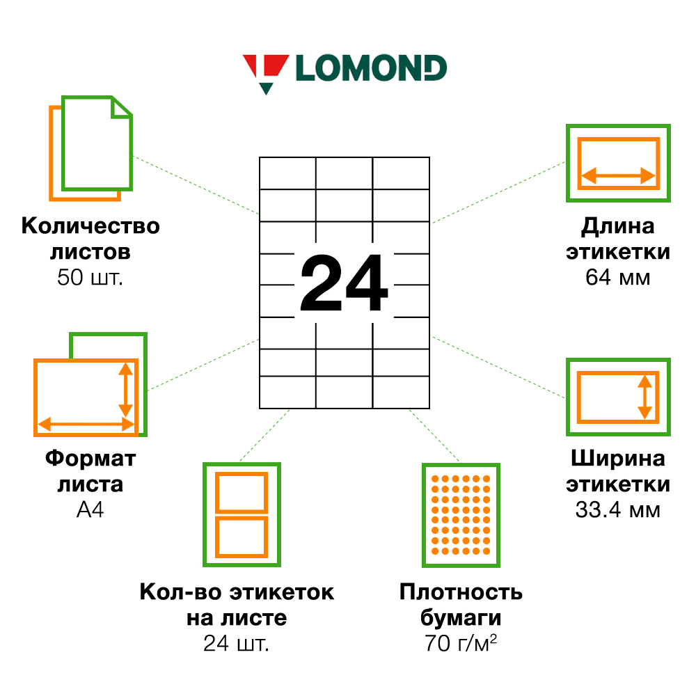 Самоклеящаяся бумага Lomond белая, 50 листов, А4, 24 этикетки, 64*33.4 мм