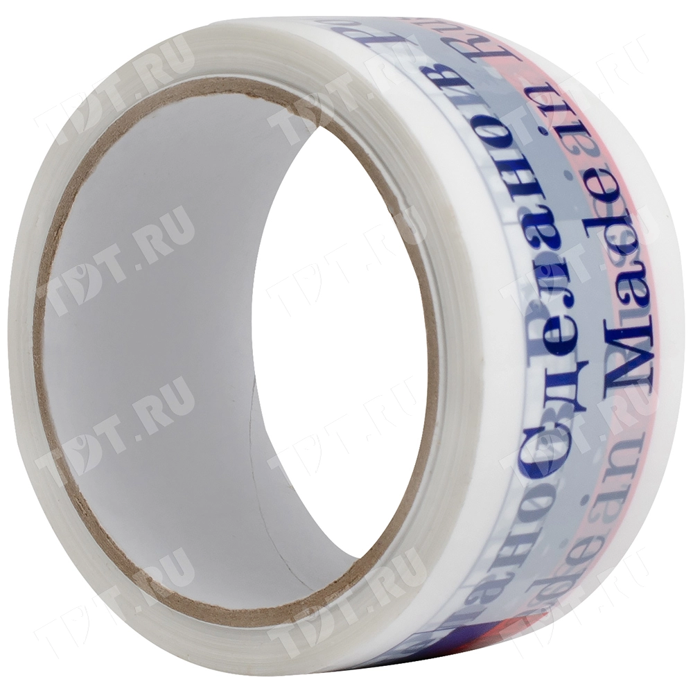 Белая клейкая лента с синей надписью «Сделано в России» и российским флагом шириной 48 мм, диаметром втулки 76 мм, намоткой 51 метр. Изготовлена на основе полипропилена.