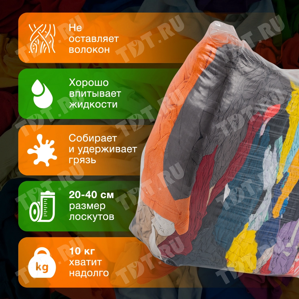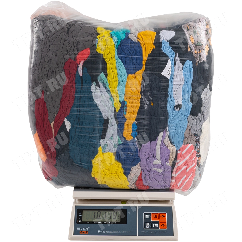 Цветная трикотажная ветошь, весом 10 кг. Материал – 100% хлопок. Производится в России.