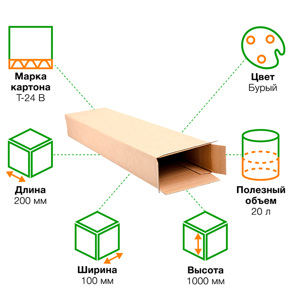Короб №57 бурый, длиной 200 мм, шириной 100 мм и высотой 1000 мм. Изготовлен из трёхслойного картона Т-24 В. Полезный объём — 20 л.