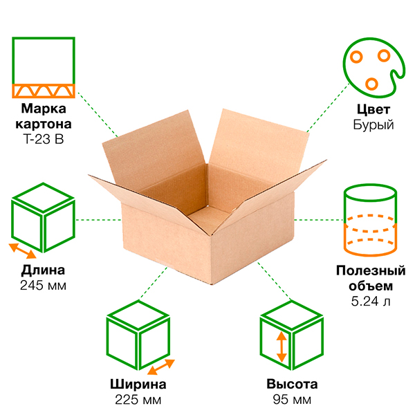 Короб К-61 бурого цвета, длиной 245 мм, шириной 225 мм и высотой 95 мм. Изготовлен из трехслойного картона марки Т-23 В. Полезный объём — 5.24 л.