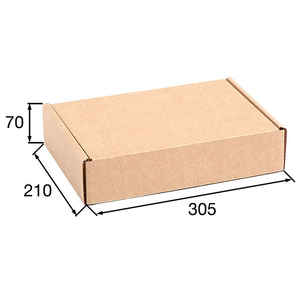 Короб №70 бурого цвета, длиной 305 мм, шириной 210 мм и высотой 70 мм. Изготовлен из гофрокартона Т-23 В. Полезный объём — 4.5 л.