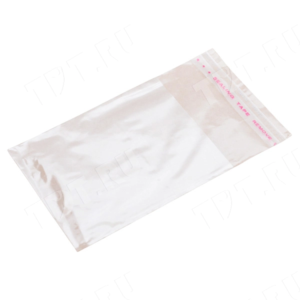 БОПП пакеты со скотчем, прозрачного цвета, длиной 10 см, шириной 8 см, толщиной 25 мкм, со стандартным клапаном 3 см, в упаковке по 100 штук. Материал – полипропилен. Производятся в России.