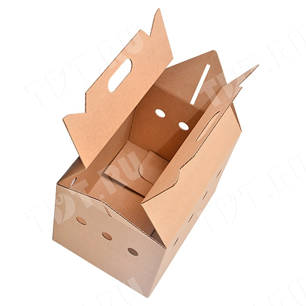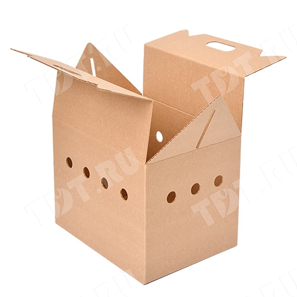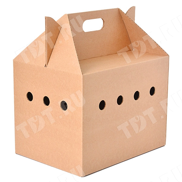 Картонная переноска для животных, бурого цвета, длиной 400 мм, шириной 300 мм, высотой 300 мм, маркой картона Т-23 В, весом 300 г. Производится в России.