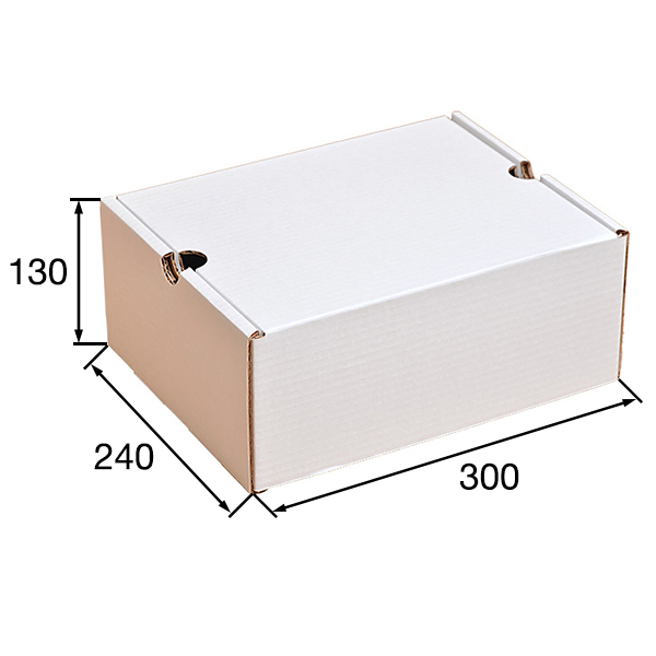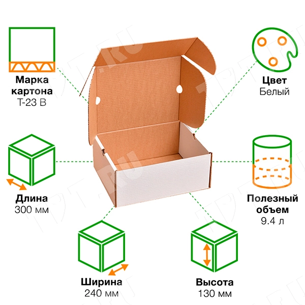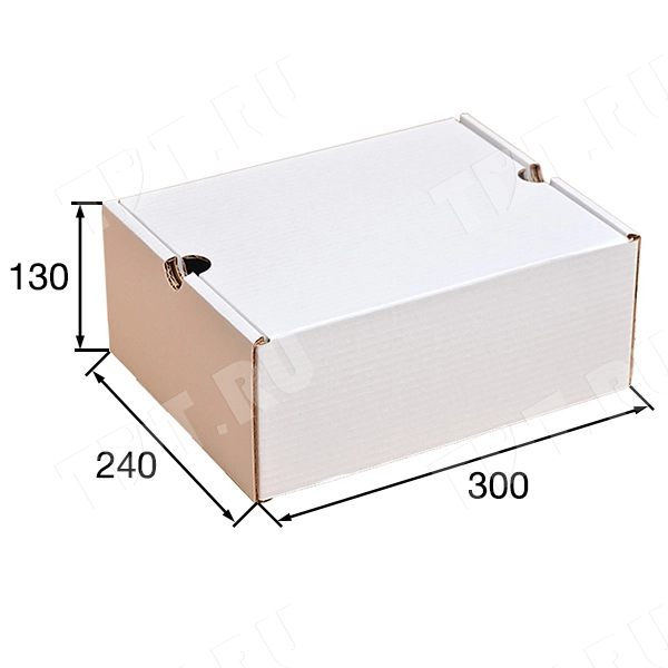 Коробка для обуви №77 белёная, длиной 300 мм, шириной 240 мм и высотой 130 мм. Изготовлена из трёхслойного картона Т-23 В. Полезный объём — 9.4 л.