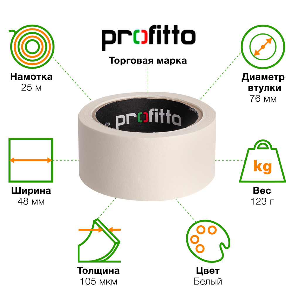 Малярная лента «Profitto» шириной 48 мм, диаметром втулки 76 мм, намоткой 25 метров.