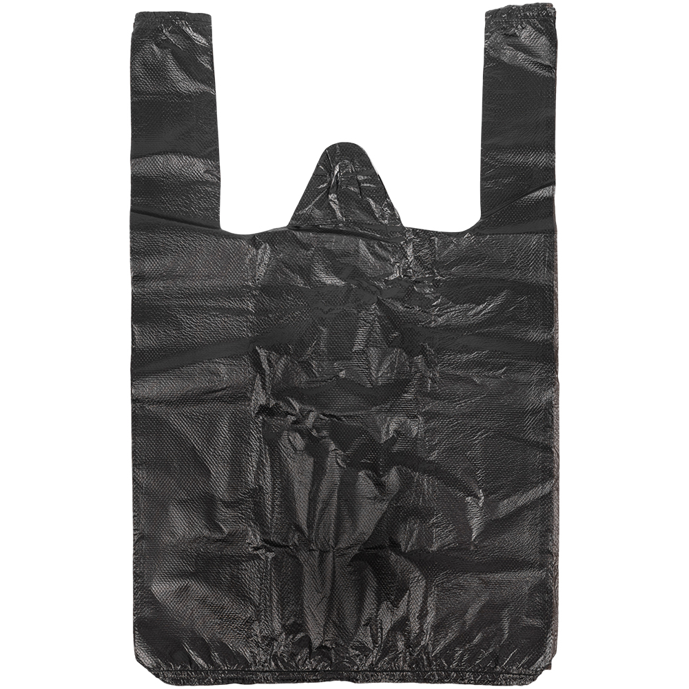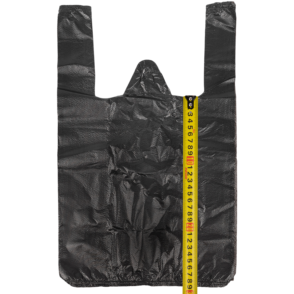 Полиэтиленовые пакеты майка ПНД, черного цвета, длиной 45 см, шириной 25+12 см, толщиной 9 мкм, в упаковке 100 штук. Материал – полиэтилен низкого давления. Производятся в России.