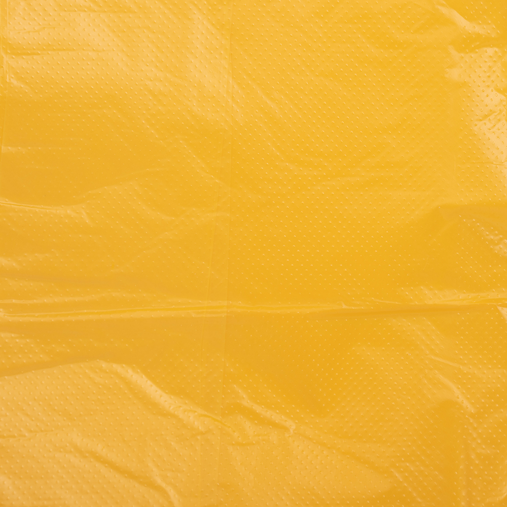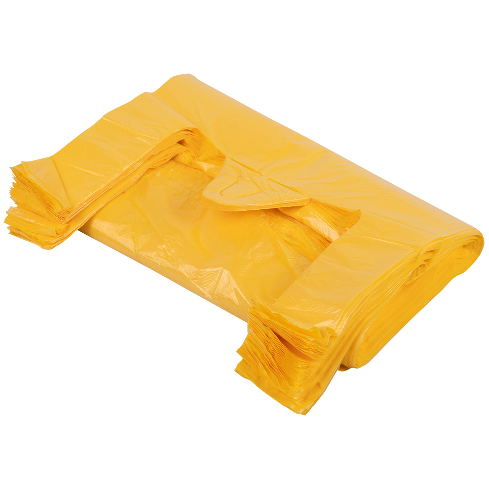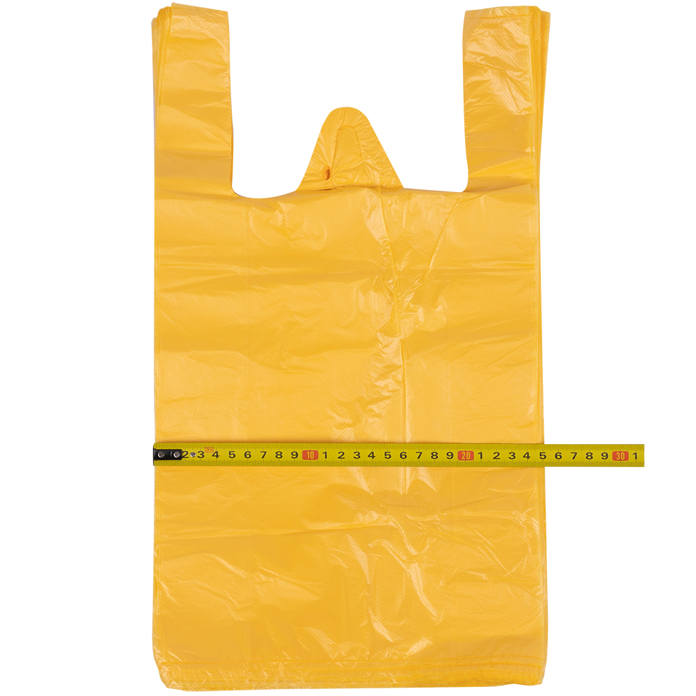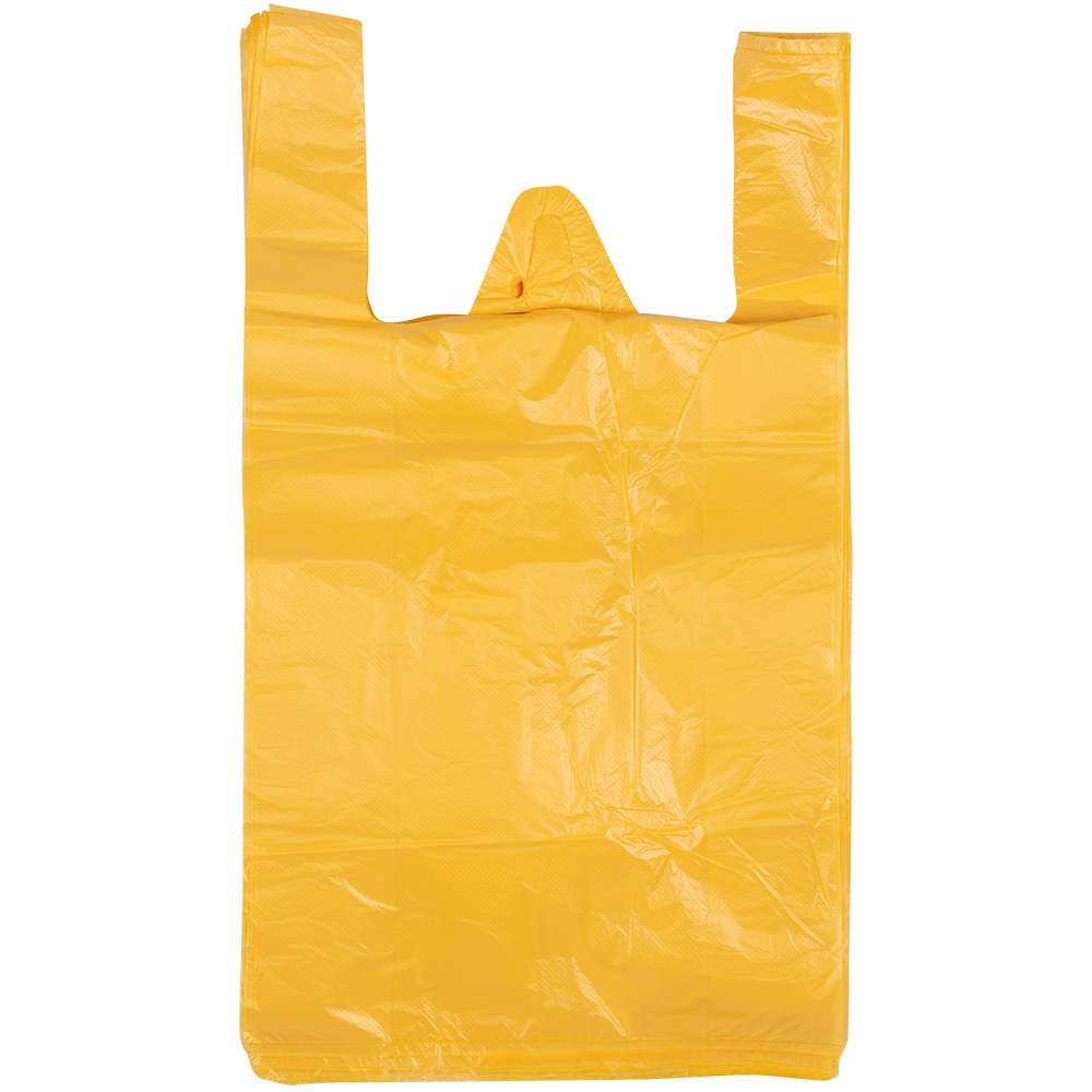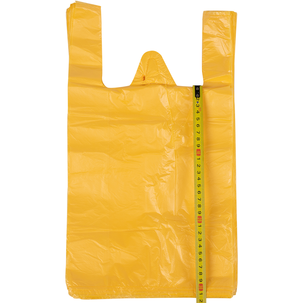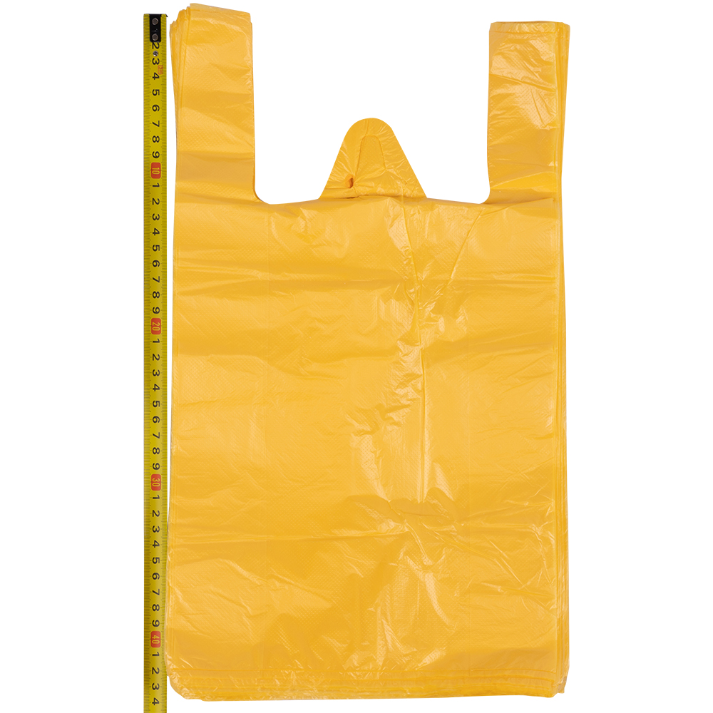 Полиэтиленовые пакеты майка ПНД, желтого цвета, длиной 45 см, шириной 25+12 см, толщиной 11 мкм, в упаковке 100 штук. Материал – полиэтилен низкого давления. Производятся в России.