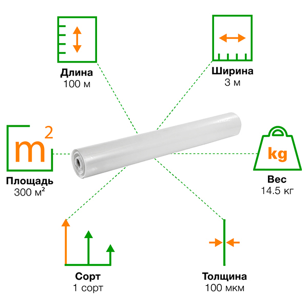 Прозрачная пленка ПВД (1 сорта) в рулоне, толщиной 100 мкм, шириной 1,5 м, длиной 100 м, общей площадью в 300 м². Пленка производится в России.