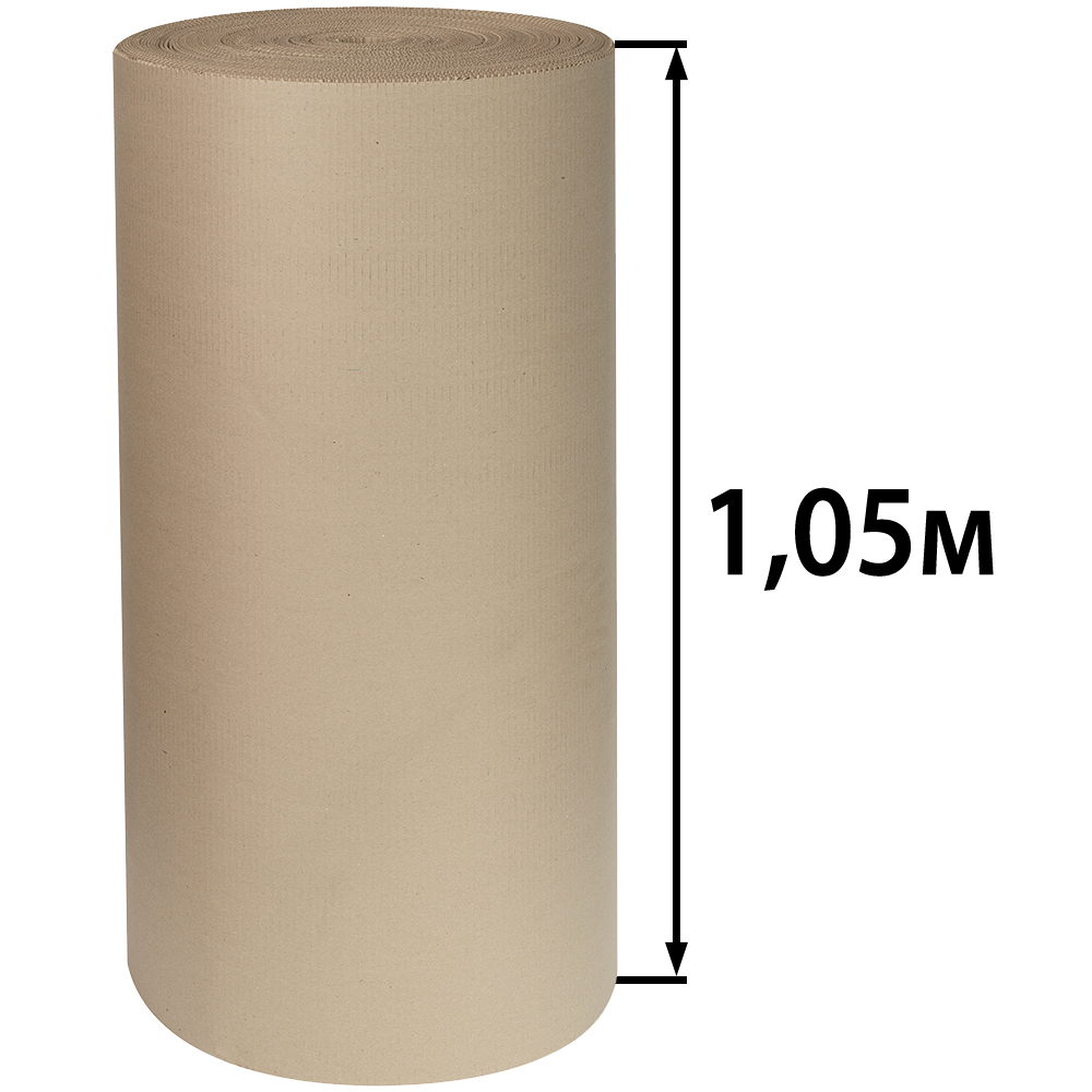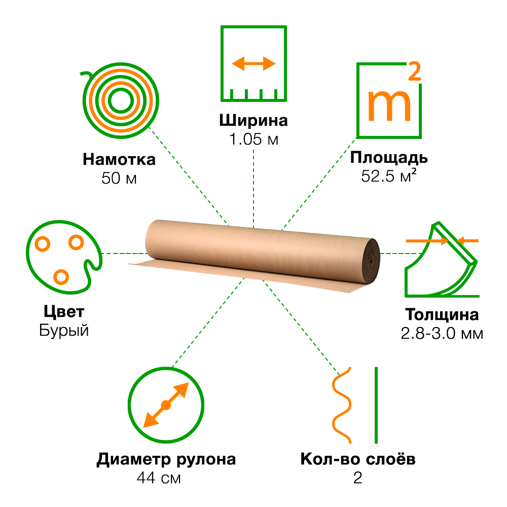 Рулонный гофрокартон бурого цвета, намоткой 50 м, шириной 1.05 м, толщиной 2.8-3.0 мм, площадью 52.5 м². Производится в России.