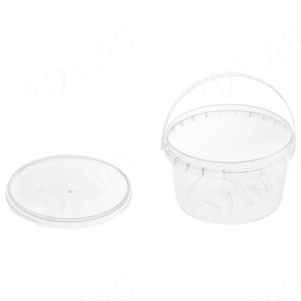Прозрачные пластиковые ведра с крышками объемом 0.8 л, высотой 97 мм, диаметром верха 131 мм, низа 105 мм. Материал – полипропилен. Производятся в России.