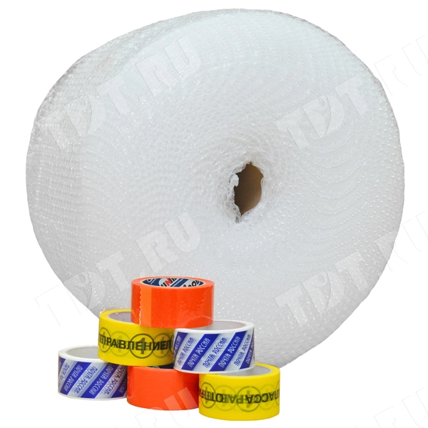 Прозрачная двухслойная воздушно-пузырчатая пленка «Компакт», намоткой 50 м, шириной рулона 0.3 м, диаметром пузырька 10 мм, плотностью 40 г/м². Изготовлена из полиэтилена. Производится в России.