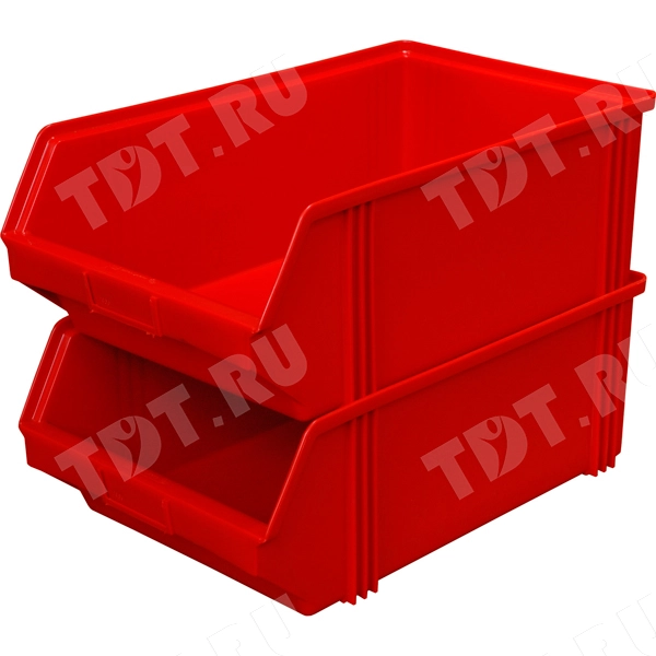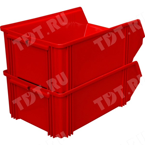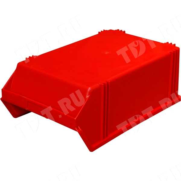 Пластиковый ящик красного цвета для хранения и транспортировки пищевой, фармакологической, автомобильной продукции, мелких деталей, медикаментов, инструментов и иных изделий, длиной 500 мм, шириной 310 мм, высотой 183 мм. Изготовлен из полиэтилена. Производится в России.