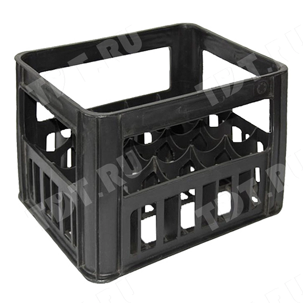 Пластиковый ящик черного цвета для хранения и транспортировки бутылок длиной 400 мм, шириной 320 мм, высотой 280 мм. Ящик вмещает 20 бутылок по 0,5 литра. Изготовлен из полиэтилена. Производится в России.