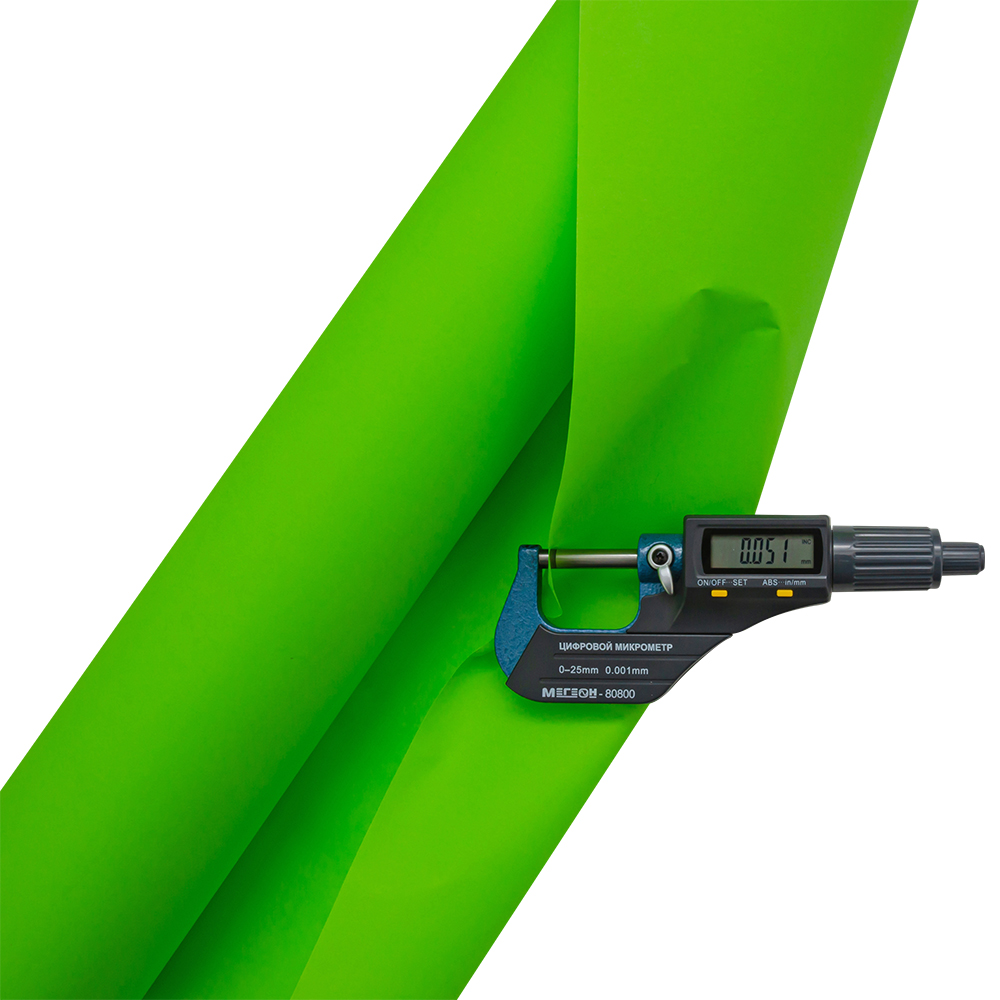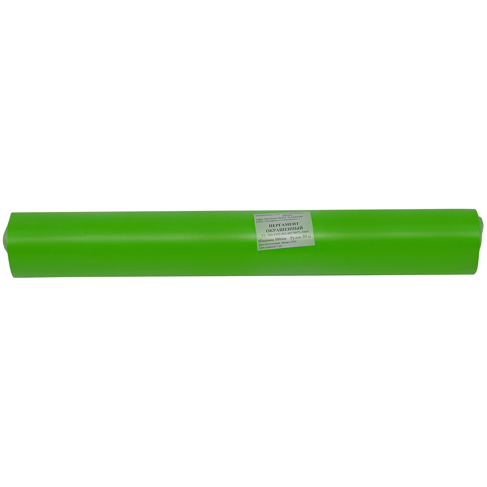 Пергамент в рулоне, салатового цвета, шириной 50 см, намоткой 50 м, толщиной 50 мкм. Флористический пергамент изготовлен из натуральной целлюлозы и окрашен в насыщенный цвет. Прочный, не боится влаги. Производится в России.