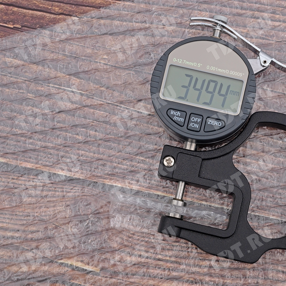 Листы из трехслойной воздушно-пузырчатой пленки, длиной 20 см, шириной 20 см, диаметром пузырька 10 мм, плотностью 60 г/м². Изготовлены из полиэтилена. Производятся в России.