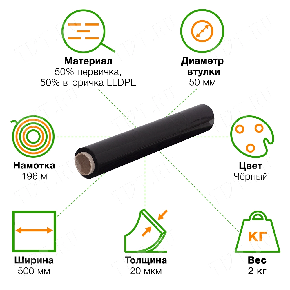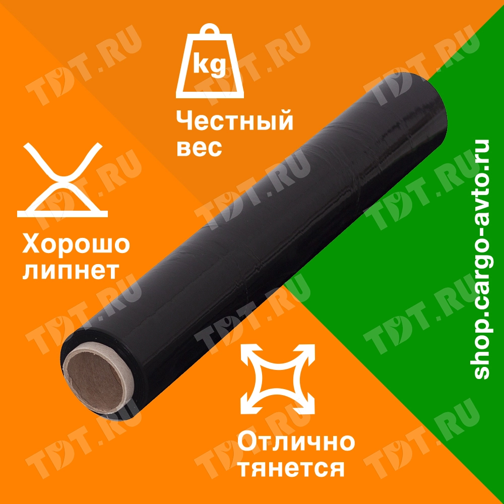 Черная стрейч пленка в рулоне ЭКОНОМ, намоткой 196 м, шириной 500 мм, толщиной 20 мкм. Изготовлена из вторичных гранул LLDPE. Производится в России.